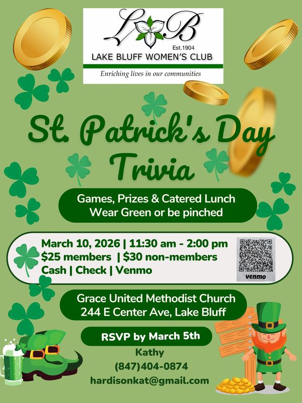 Great prizes too! 11:30-2pm. $25 members / $30 non-member. Cash / Check or Venmo. Feelin' the luck of the Irish?...bring a friend. Grace United Methodist Church, 244 E. Center Ave. Lake Bluff, Il. RSVP by March 5th. Call or email Kathy (847)404-0874 or hardisonkat@gmail.com